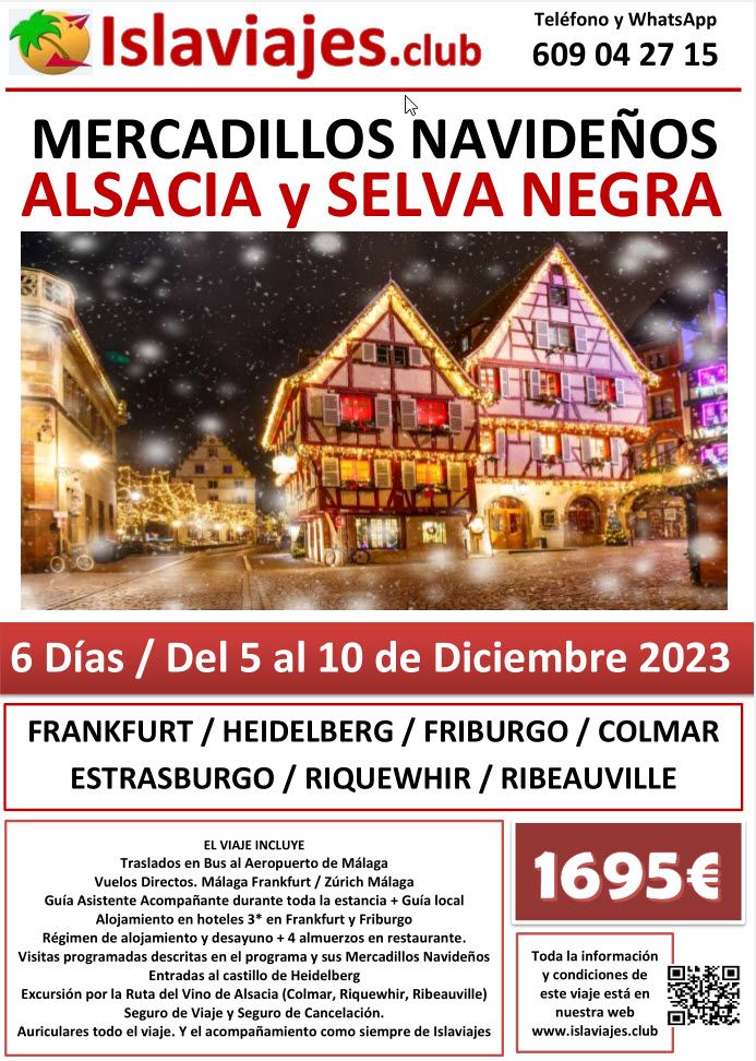 A inicios de diciembre, cuando el invierno hacen su aparición, Europa busca el calor y la luz de los mercados de Adviento, llenos de adornos artesanales y con el aroma de castañas asadas, dulces de Navidad y bebidas calientes en el aire. La musiquilla de los villancicos y sus luces de colores. Los puestos de artículos navideños tan bonitos, las casas y los edificios adornados con tantísimo gusto. Su origen se pierde en el siglo XVI cuando nacieron con la excusa de reunirse en un lugar acogedor a la llegada del invierno. En Islaviajes llevamos muchos años siguiendo esta tradición de viajar a los Mercadillos Navideños de Europa que tanto le gustan a nuestros clientes y amigos. En este diciembre de 2023 vamos a disfrutar de uno de los más bonitos sin lugar a dudas, los mercadillos de Alsacia y la Selva Negra, y que tanto nos habíais pedido. Un viaje de ensueño. Será un viaje de 6 días entre el Martes 5 y el domingo 10 de diciembre, aprovechando como siempre el Puente de la Constitución y la Inmaculada. Vente con tus familiares y amigos en un viaje que recordará para siempre. No te lo puedes perder.