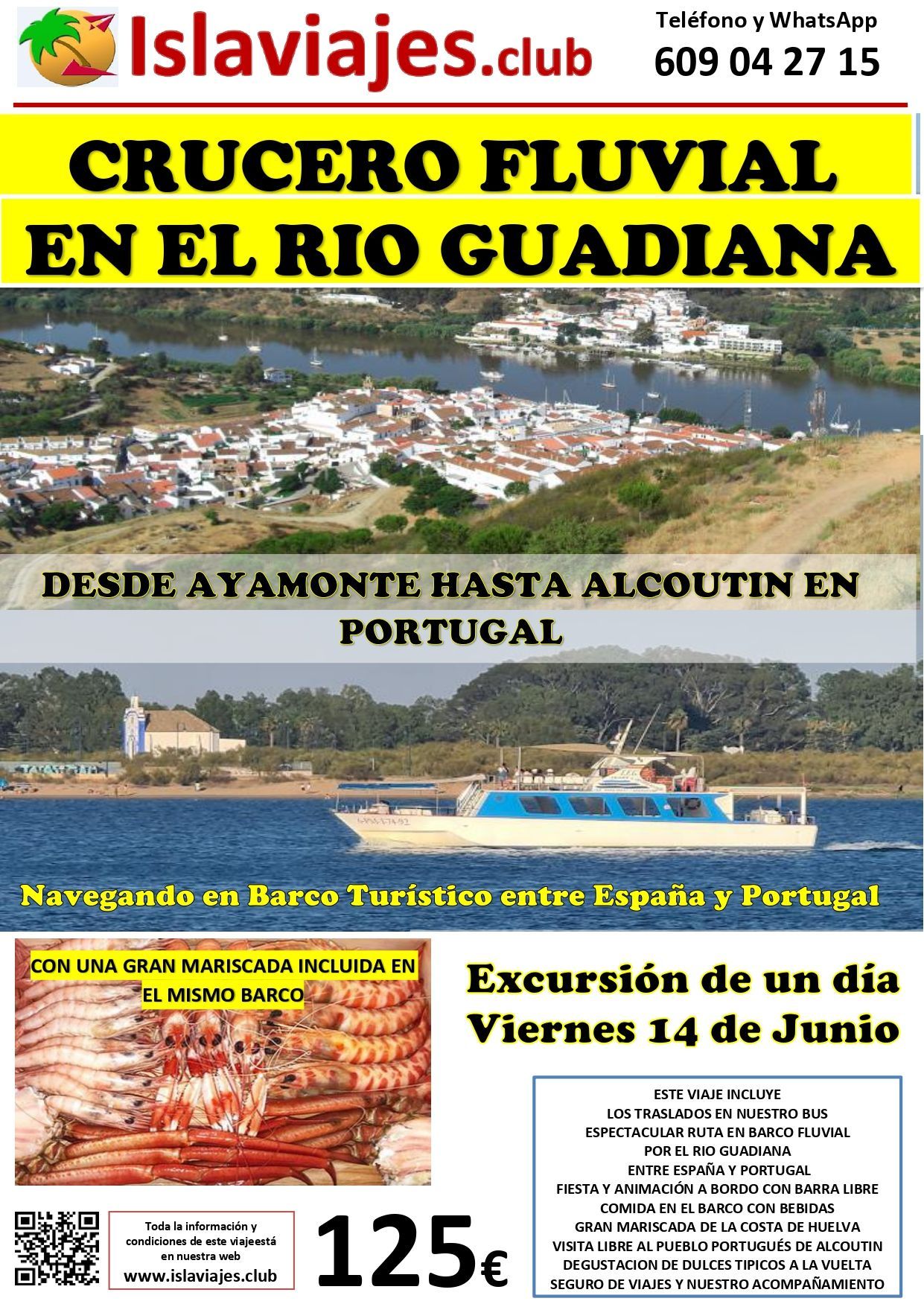 Ya está a la venta la Excursión de un día Recorriendo la frontera entre España y Portugal a bordo de un Crucero Fluvial en el Rio Guadiana. Una experiencia preciosa que no te puedes perder. En nuestro Bus nos dirigiremos hasta Ayamonte, "Huelva" donde se unen el mar y la desembocadura del Guadiana. A bordo de un Barco Turístico acondicionado para que te lo pases en grande. Saldremos en el barco desde Ayamonte alrededor de las 11:30 de la mañana e iniciaremos la ruta fluvial subiendo el Guadiana hasta el pintoresco pueblo portugués de Alcoutin, con unas vistas impresionantes al Pueblo de la Comarca del Andévalo Onubense "Sanlúcar de Guadiana" donde se rodó la serie de Televisión Española "La Caza". El recorrido del Crucero Fluvial es precioso. Adentrándonos en la Naturaleza desde el principio hasta el fin. Con España y Portugal a Izquierda y derecha y nosotros en medio. Un placer inolvidable. En el Barco tendremos mucha animación todo el recorrido. Habrá Música, Fiesta y por supuesto vamos a disfrutar de comida y bebida todo lo que queramos. Y por supuesto remarcado con una gran Mariscada con lo mejor de la Costa de Huelva. Y siempre por supuesto con Barra Libre. Al regreso tendremos también degustación de dulces y algunas sorpresillas que no contamos. Echaremos un día inolvidable.